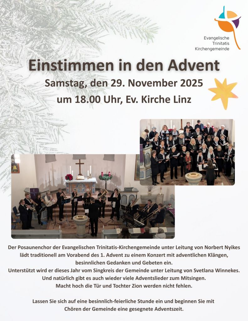 Die Evangelische Trinitatis-Kirchengemeinde lädt herzlich dazu ein, den Beginn der Adventszeit gemeinsam zu feiern. Am Samstag, 29. November 2025, findet um 18 Uhr in der Evangelischen Kirche Linz das traditionelle Adventskonzert „Einstimmen in den Advent“ statt. Der Abend wird gestaltet vom Posaunenchor unter der Leitung von Norbert Nyikes sowie dem Singkreis, geleitet von Svetlana Winnekes. Gemeinsam schaffen beide Ensembles eine stimmungsvolle musikalische Atmosphäre aus besinnlichen Adventsliedern, feierlichen Bläserklängen und vertrauten Melodien, die zum Mitsingen einladen. Das Konzert bietet eine wunderbare Gelegenheit, dem vorweihnachtlichen Trubel einen Moment zu entfliehen und sich gemeinsam mit anderen Gemeindemitgliedern und Gästen auf die Ankunft des Lichtes einzustimmen.