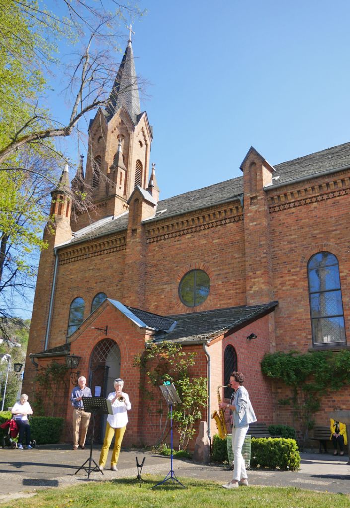 Am Morgen des Ostersonntag, nach dem Fernsehgottesdienst, haben Gudrun Brüdern und Sibylle Schoppmann "Christ ist erstanden" und ein paar Lieder mehr mit Trompete und Saxophon vor unserer Linzer Kirche intoniert. Wir haben mitgesungen und Passanten gesellten sich abstandsgerecht dazu. Das wiederholte sich dann noch an der katholischen St. Martins Kirche in Linz, wo auch Gemeindereferentin Eva Maria Dech mit einem brennenden Osterlicht vorbeikam und mitsang.